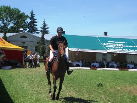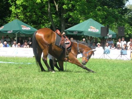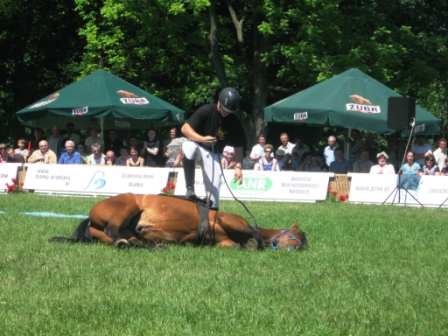 Na zakończenie na prośbę Pawła Wicher położył się i leżąc spokojnie skubał trawę, gdy jeździec stanął na nim i nad głową wymachiwał liną. Z równym spokojem ewolucje stojącej na siodle Pauliny znosiła Hortensja- dając także dowód zaufania do swojego jeźdźca.