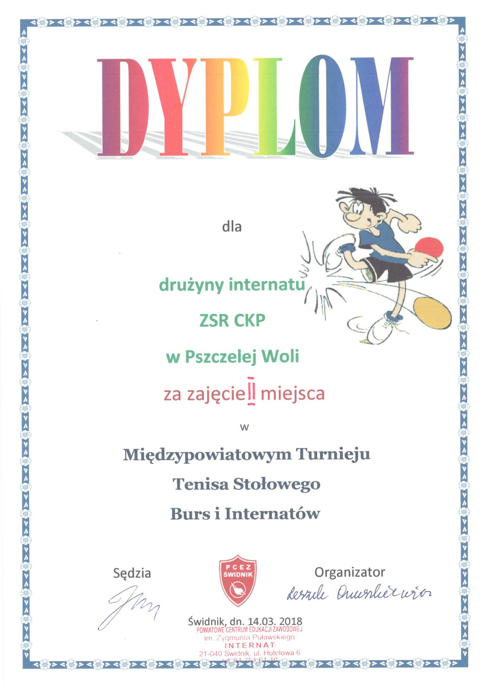 Reprezentacja internatu z Pszczelej Woli w składzie: Agata Kolibska, Jakub Dudek, Mateusz Sasin i Mateusz Borowiec zajęła II miejsce w Międzypowiatowym Turnieju Tenisa Stołowego Burs i Internatów zorganizowany przez Powiatowe Centrum Edukacji Zawodowej w Świdniku.