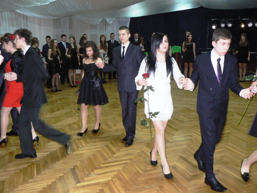 Bal rozpoczął się uroczystym polonezem, a następnie życzenia dobrej zabawy i sukcesów na egzaminie gimnazjalnych przekazał uczniom pan dyrektor Mirosław Worobik. Gimnazjaliści pełni tremy podziękowali dyrekcji i nauczycielom wręczając kwiaty. Po części oficjalnej była bardzo miła wspólna zabawa uczniów, nauczycieli i zaproszonych gości.