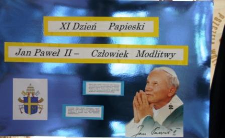 Z okazji XI Dnia Papieskiego we wtorek 18 października odbyła się w naszej szkole akademia poświęcona osobie Jana Pawła II, podczas której uczniowie zapoznali się z prezentacją na temat życia i dzieła Ojca Świętego, a także wystawa poświęcona nauczaniu papieskiemu.