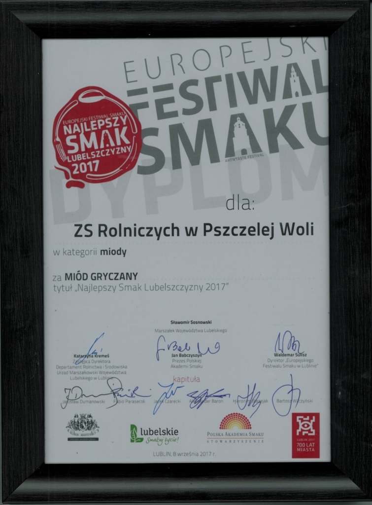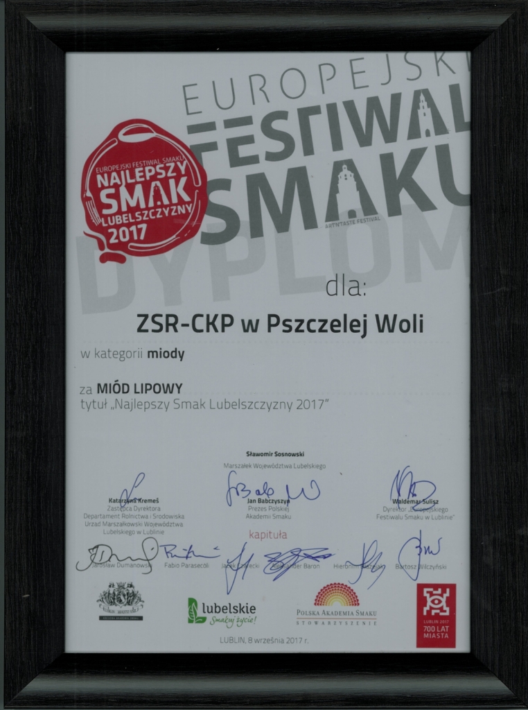 Nasza szkoła została doceniona w kategorii konkursowej: miód, gdyż zwycięzcami konkursu zostały miody: gryczany i lipowy z pasieki ZSR CKP w Pszczelej Woli.