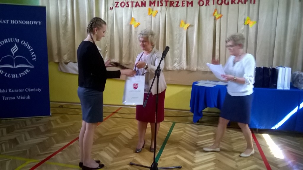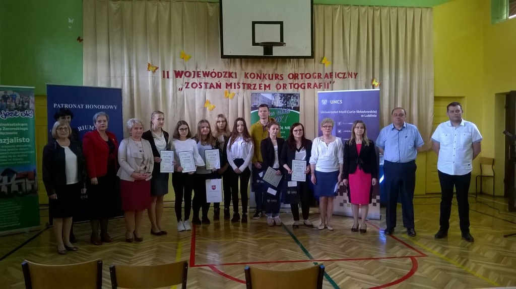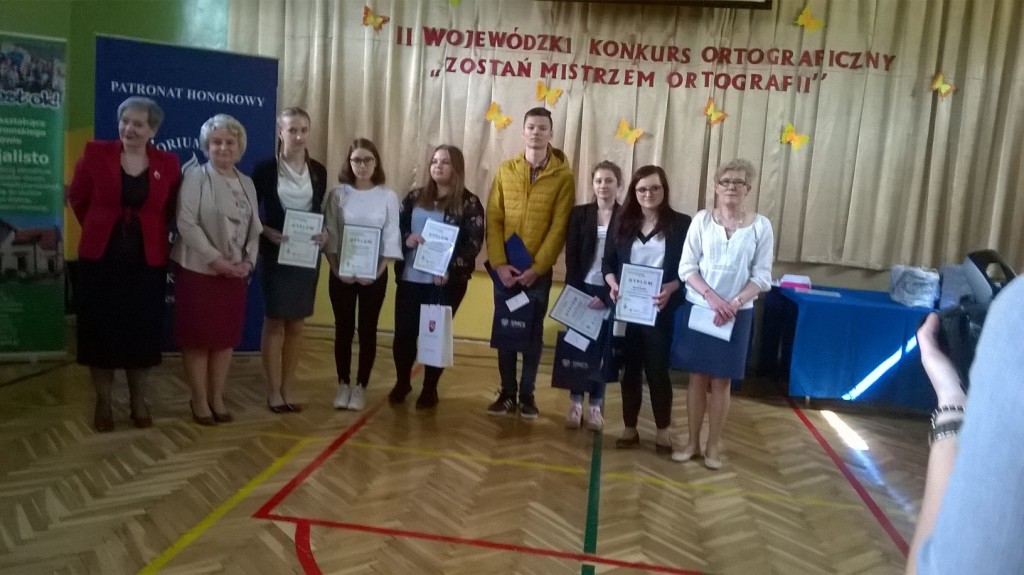 11 kwietnia br. w Zespole Szkół Nr 2 w Nałęczowie odbył się II Wojewódzki Konkurs Ortograficzny „Zostań Mistrzem Ortografii” pod patronatem UMCS i Lubelskiego Kurato-rium Oświaty. Nasze gimnazjum reprezentowały cztery uczennice: Julia Kępowicz z klasy II a oraz Weronika Szewczyk, Aleksandra Dziedzic i Emilia Górniak z klasy III b. Ten etap konkursu składał się z dyktanda i testu sprawdzającego znajomość reguł ortograficznych. Liczba uzyskanych z obu części punktów uplasowała Aleksandrę Dziedzic na 2. miejscu, a Weronikę Szewczyk na 3.