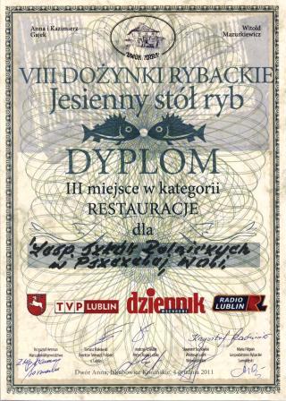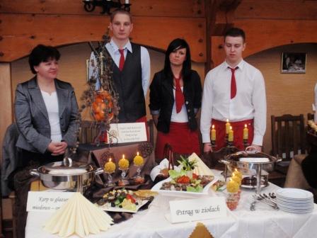 W dniu 04.12.2011r. w Dworze Anna w Jakubowicach Konińskich odbyły się VIII Dożynki Rybackie. W konkursie na najlepszą potrawę z ryb uczniowie Technikum Żywienia i Gospodarstwa Domowego naszej szkoły zaserwowali karpia w glazurze miodowo-orzechowej. Jury, w skład którego wchodzili przedstawiciele Urzędu Marszałkowskiego w Lublinie, Radia i Telewizji Lublin oraz gospodarstw rybackich miało przed sobą trudne zadanie – spróbować i ocenić kilkanaście potraw przygotowanych przez restauracje, gospodarstwa rybackie i koła gospodyń wiejskich. Werdykt bardzo nas ucieszył. Zajęliśmy III miejsce w kategorii restauracje. W nagrodę otrzymaliśmy puchar ufundowany przez Marszałka Województwa Lubelskiego Pana Krzysztofa Hetmana oraz komplet wysokiej klasy sztućców do ryb. Pragniemy serdecznie podziękować właścicielom Dworu Anna Państwu Annie i Kazimierzowi Gajek oraz Panu Witoldowi Mazurkiewiczowi za zaproszenie nas do udziału w konkursie.