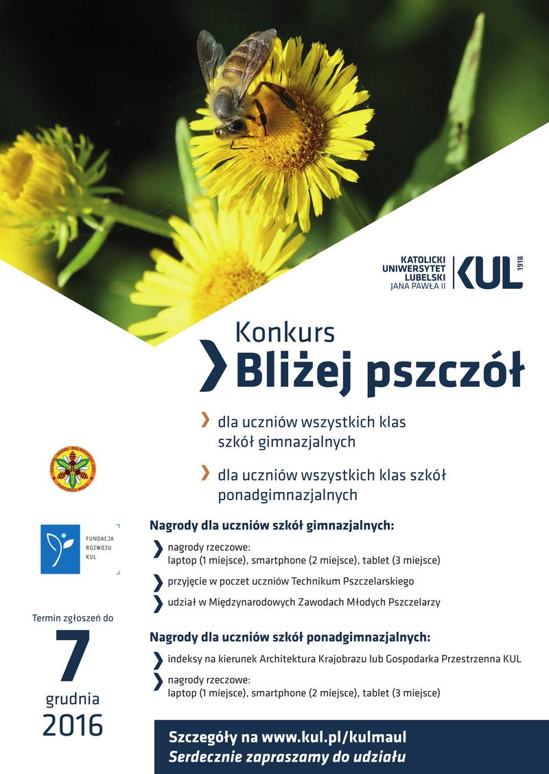 Celem konkursu "Bliżej pszczół" jest popularyzacja wśród uczniów szkół gimnazjalnych i ponadgimnazjalnych roli pszczoły miodnej w środowisku naturalnym oraz wiedzy odnośnie możliwości funkcjonowania pszczoły miodnej w industrialnej rzeczywistości. Ponadto zachęcenie młodych ludzi do obserwowania życia pszczół i ich zwyczajów, zaczerpnięcia wiedzy na temat roślin miododajnych i pszczelarstwa oraz uświadomienia młodzieży znaczenia produktów pszczelich dla zdrowia człowieka.