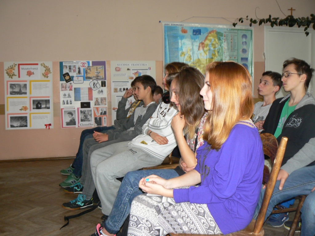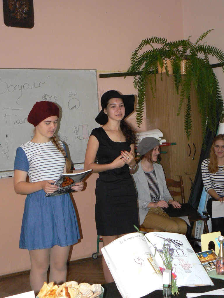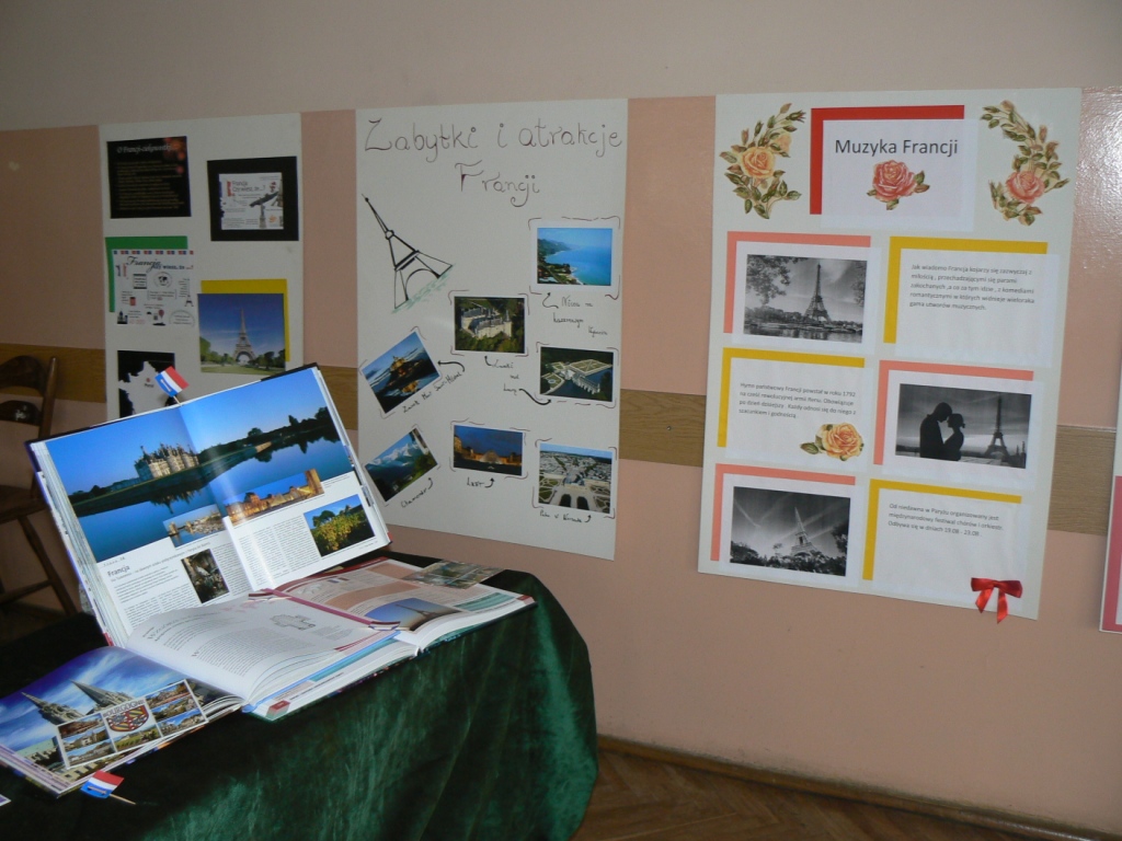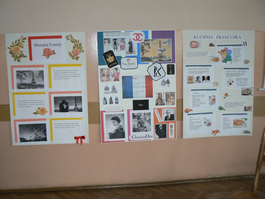 Dziewczęta przygotowały prezentacje multimedialne oraz tablice informacyjne. Zabrały zgromadzonych w niezapomnianą podróż. Podczas pokazu uczniowie klas II a i II b mieli okazję zapoznać się z kulturą, geografią, modą, muzyką, kuchnią francuską jak również poznać interesujące ciekawostki. Uczestnicy mogli skosztować specjałów przygotowanych przez zespół projektowy. Spotkaniu towarzyszyła wystawa eksponująca atrybuty kojarzące się z Francją. Nie zabrakło oczywiście ziół, serów, bagietek, zdjęć, albumów tematycznych, magazynów i perfum. Quizy przygotowane przez uczennice jak również charakterystyczne utwory i melodie wpłynęły na aktywny udział uczniów, pozytywną atmosferę i niezapomniane wrażenia.
