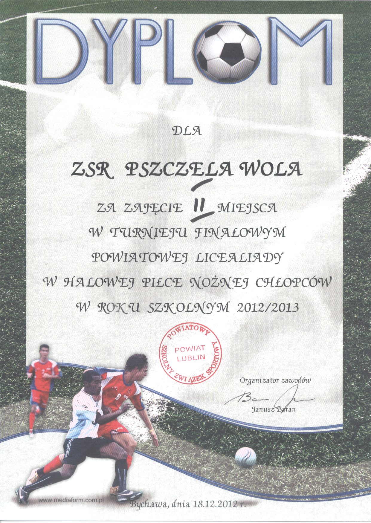 18 grudnia 2012 roku nasi uczniowie brali udział w finale rozgrywek halowej piłki nożnej powiatu lubelskiego chłopców szkół średnich w ramach Licealiady 2012/2013. Zawody odbywały się w Zespole szkół im. Ks. Kwiatkowskiego w Bychawie.Warto przypomnieć że kilka dni wcześniej rozegrano zawody półfinałowe, w wyniku których Pszczela Wola awansowała do ścisłego finału, w którym pokonaliśmy drużyny z Piotrowic, Bełżyc, aby dopiero w finale ulec nieznacznie gospodarzom – ZS im. Ks. Kwiatkowskiego z Bychawy.
