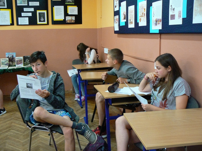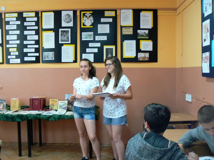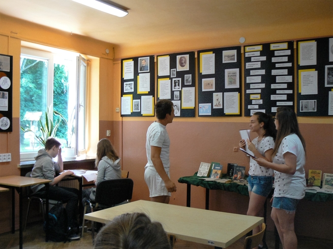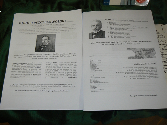 w składzie: Michał Skrzypczak, Michał Podsiadły, Filip Sieńko, Małgorzata Stec, Agnieszka Smoleń, Karolina Bogut, Wojciech Wachowski, Marieta Trynkiewicz, Julita Pyrda zaprezentowali efekty swojej pracy w bibliotece szkolnej. Michał, Filip i Michał przygotowali plansze zawierające informacje o życiu i dorobku literackim Henryka Sienkiewicza, wystawę książek i artykułów dotyczących pisarza, ciekawych wydań jego powieści i nowel. Zadaniem Małgorzaty i Agnieszki było wykonanie prezentacji multimedialnej na temat biografii noblisty, przyznania Nagrody Nobla, pokazanie jego szerokiej działalności nie tylko literackiej (dziennikarz, podróżnik traper, społecznik). Karolina i Wojtek zredagowali gazetkę okolicznościową pt. „Kurier pszczelowolski” poświęconą pisarzowi (biografia, twórczość