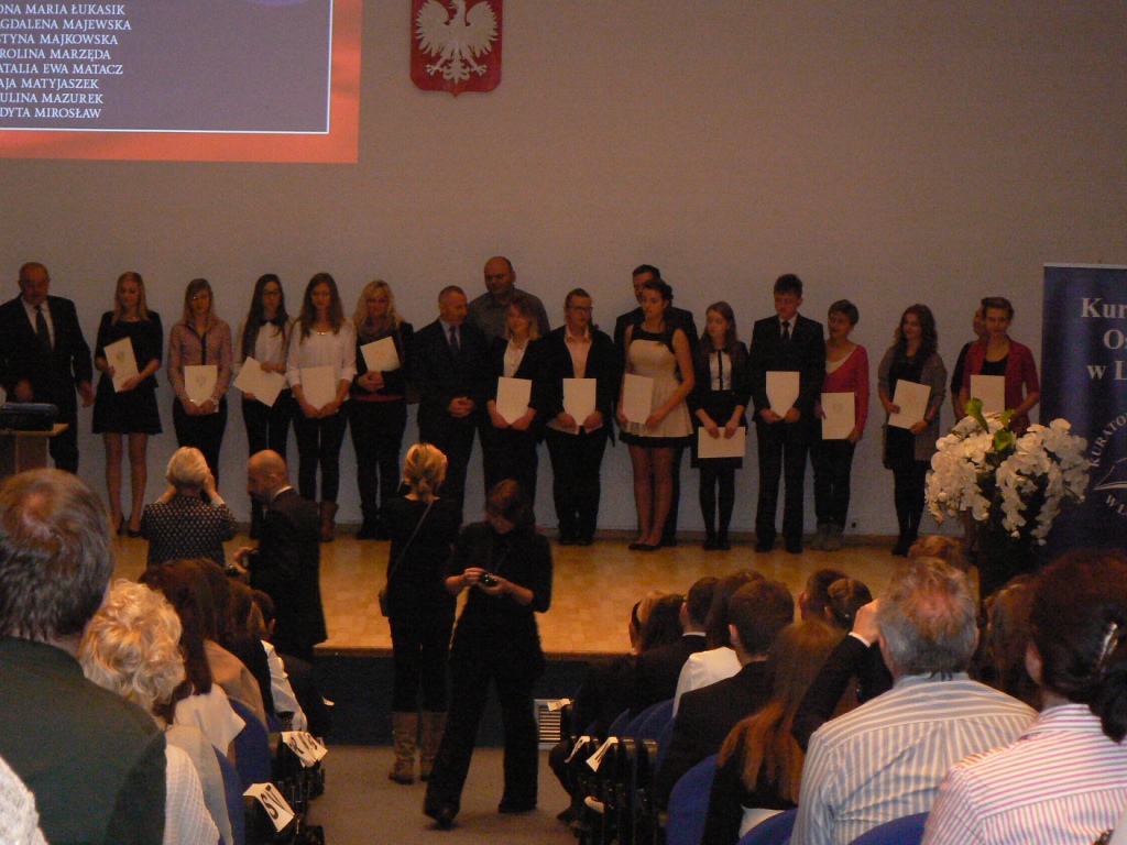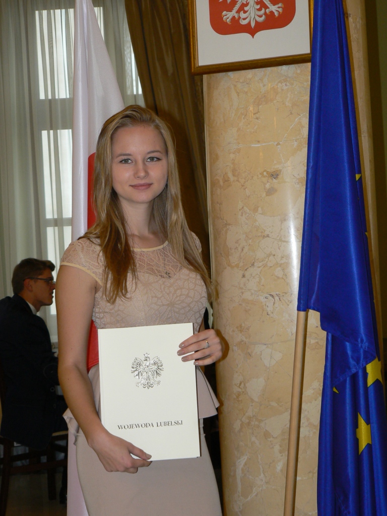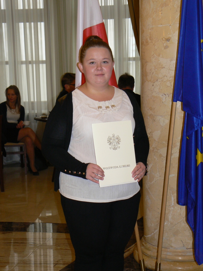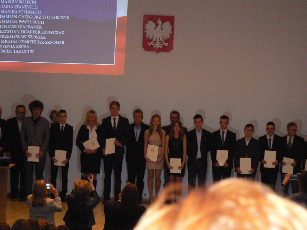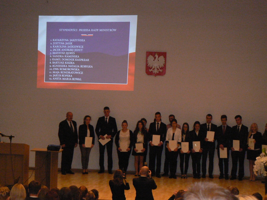 Stypendia Prezesa Rady Ministrów W dniu 21 października 2015 r. w Sali Błękitnej Lubelskiego Urzędu Wojewódzkiego miała miejsce uroczysta gala wręczenia dyplomów stypendystom Prezesa Rady Ministrów za rok szkolny 2014/15. Stypendium to przyznawane jest najlepszym uczniom szkół ponadgimnazjalnych kończących się egzaminem dojrzałości. Przyznaje się je jednemu uczniowi danej szkoły na okres od września do czerwca w danym roku szkolnym. W gronie stypendystów znaleźli się oczywiście uczniowie naszej szkoły. W tym roku stypendium Prezesa Rady Ministrów otrzymały: Justyna Jasik – II C Technikum Kelnerskiego, Paulina Mazurek – III A Liceum Ogólnokształcącego, Anna Rozdzialik – IV Technikum Żywienia i Usług Gastronomicznych, Daria Stanevich – III Technikum Pszczelarskiego. W uroczystości wzięli udział Wicewojewoda Lubelski Pan Marian Starownik oraz Lubelski Kurator Oświaty Pan Krzysztof Babisz. Gratulujemy stypendystkom i życzymy dalszych sukcesów w nauce.
