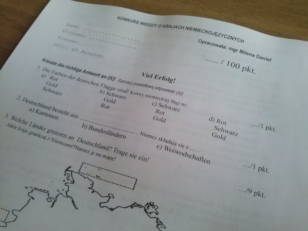 Dnia 30.05.2014 odbył się Szkolny Konkurs Wiedzy o Krajach Niemieckojęzycznych dla uczniów I klas Gimnazjum. Uczestnicy zmagali się z szeregiem pytań dotyczących Niemiec, Austrii, Szwajcarii i Liechtensteinu. Łatwo nie było, ale mamy zwycięzców: