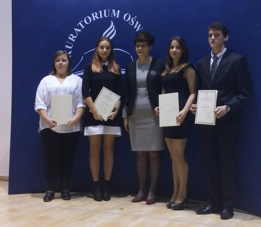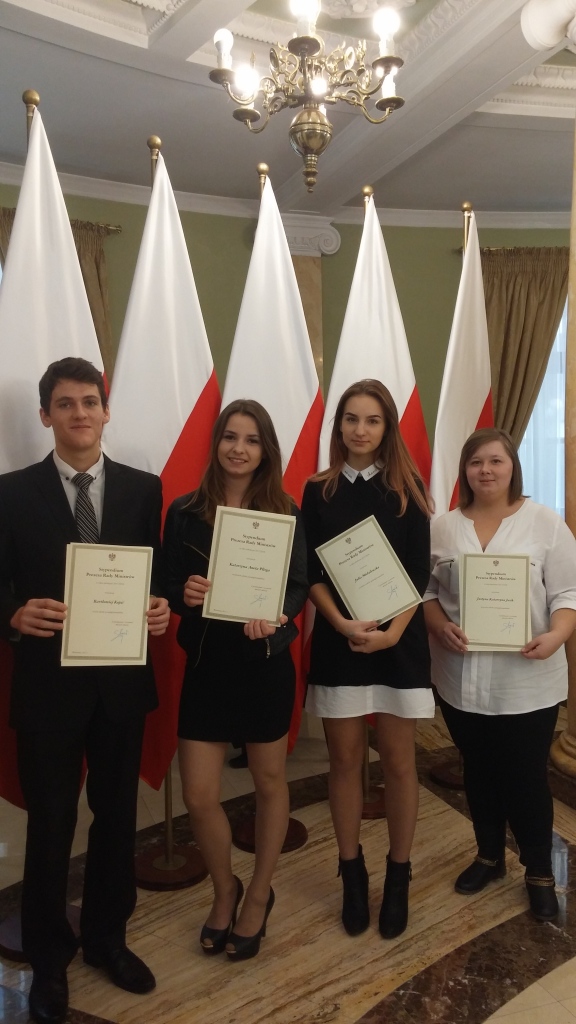 W dniu 7 listopada 2017 r. w Sali Błękitnej Lubelskiego Urzędu Wojewódzkiego miała miejsce uroczysta gala wręczenia dyplomów stypendystom Prezesa Rady Ministrów. Stypendium to przyznawane jest najlepszym uczniom szkół ponadgimnazjalnych kończących się egzaminem dojrzałości. Nagrodzeni odebrali dyplomy z rąk pani Teresy Misiuk, Lubelskiego Kuratora Oświaty oraz Wojewody Lubelskiego, pana Przemysława Czarnka. W gronie 237 stypendystów znaleźli się: Justyna Jasik – IV C Technikum Kelnerskiego, Bartłomiej Kopiś - III Technikum Pszczelarskiego, Julia Michalewska - II Liceum Ogólnokształcącego, Katarzyna Plizga – II B Technikum Żywienia i Usług Gastronomicznych. Uroczystość uświetnił występ Zespołu Pieśni i Tańca „Lublin” im. Wandy Kaniorowej. Stypendystom serdecznie gratulujemy i życzymy kolejnych sukcesów.