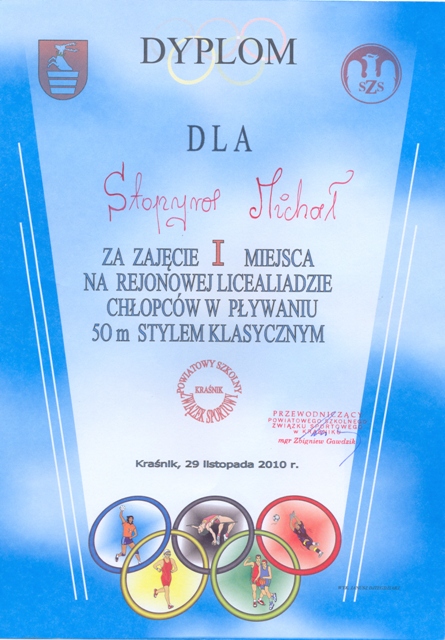 We wtorek 30 listopada w Kraśniku odbyły się rejonowe zawody pływackie, w których nasz uczeń Michał Stopyra zajął I miejsce na 50 m stylem klasycznym. Dzięki temu zwycięstwu zakwalifikował się do zawodów wojewódzkich, kóre odbędą się w Zamościu.
