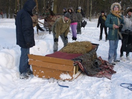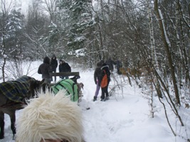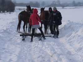 Kilka klas naszej szkoły wzięło już udział w kuligach połączonych z tradycyjnym pieczeniem kiełbasek. Długa 12,5 kilometrowa trasa z początkiem i końcem pod szkolną stajnią w większości wiedzie pętlą wokół lasu. Przed każdym wyjazdem uczniowie sami przygotowują sanie i trzy pary koni. Do tej pory najlepsze śpiewy słyszeć można było na kuligu I TP, najostrzejsza wojna na śnieżki to III LO. Konie, pod kierunkiem instruktora, zostały przygotowane i wytrenowane przez: Mateusza, Pawła i Przemka – uczniów klasy jeździeckiej przy wsparciu trenujących w sekcji uczniów technikum i gimnazjum. W saniach dzielnie pracują klacze małopolskie: Fabia, Hossa, Panama, Primera; kuce Kajetanka i Nikotyna; koniki polskie Nelma i Neska. Na czas kuligów ich podstawowe obowiązki związane z pracą w siodle zostały przejęte przez inne konie. Trwa trening kolejnych trzech koni – w przyszłorocznych kuligach pojedziemy na 5 sań.